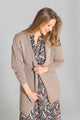 Tri-color warm long sleeve cardigan. Pockets at side seams. Cardigan unbuttoned, no belt.