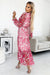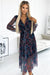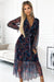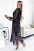 Dress with three ruffles, envelope neckline, long sleeves and belt. Made of elastic mesh on a lining. Pattern: flowers on a dark background. Brand numoco. European production.