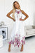 Satin pleated maxi dress with symmetrical floral pattern. Dress made of white fabric with pink flowers. Brand numoco. European production.