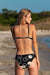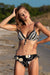 Elegant two-piece women's swimsuit with a padded push up strapless bra. Carthage is a model with removable breast enlargement inserts. The underwires lift it up and pull it inward giving a natural look. The bust looks larger more firm and voluptuous. Adjustable shoulder straps and fastens at the back with a branded buckle. Complete with very feminine patterned panties with side straps. The outfit is very comfortable and sexy!