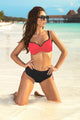 Comfortable two-piece women's swimsuit in black. Fashionable swimsuit with padded bra with underwire bottom and deepened cups. White inserts in the upper part of the cups and decorative pattern. The bra perfectly holds the breasts, lifts them up and pulls them inward making them more voluptuous. Swimsuit with adjustable, comfortable straps and metal clasp at the back. Comes with comfortable, smooth lined panties with ties. An exceptionally elegant model that will highlight the beauty of your figure!
