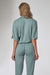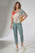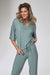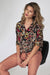 Kimono blouse with a collar forming a heart neckline. Floral pattern. Sleeve with decorative cuff to the elbow. Drawstring waist in colourful fabric.