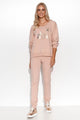 Women's sweatshirt and pants. Sweatshirt with zipper, pockets sewn on the front. Pants with binding at waist, slip pockets. Sleeves and legs finished with welts.