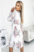 Pleated chiffon longer dress with neckline, long sleeve and belt. Dress in white with pink roses. Brand numoco.