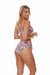 Bikini bra designed for women with medium to large breasts. The bra is made of knitted fabric in many beautiful, bright and vivid colors combined in an irregular geometric pattern. It has soft cups with modeling cuts and is padded with underwire, so it supports the bust perfectly. The straps are adjustable, non-removable. The width of the straps and the type of clasp is matched to the size of the swimsuit. A delicate decoration between the cups adds charm to the whole.